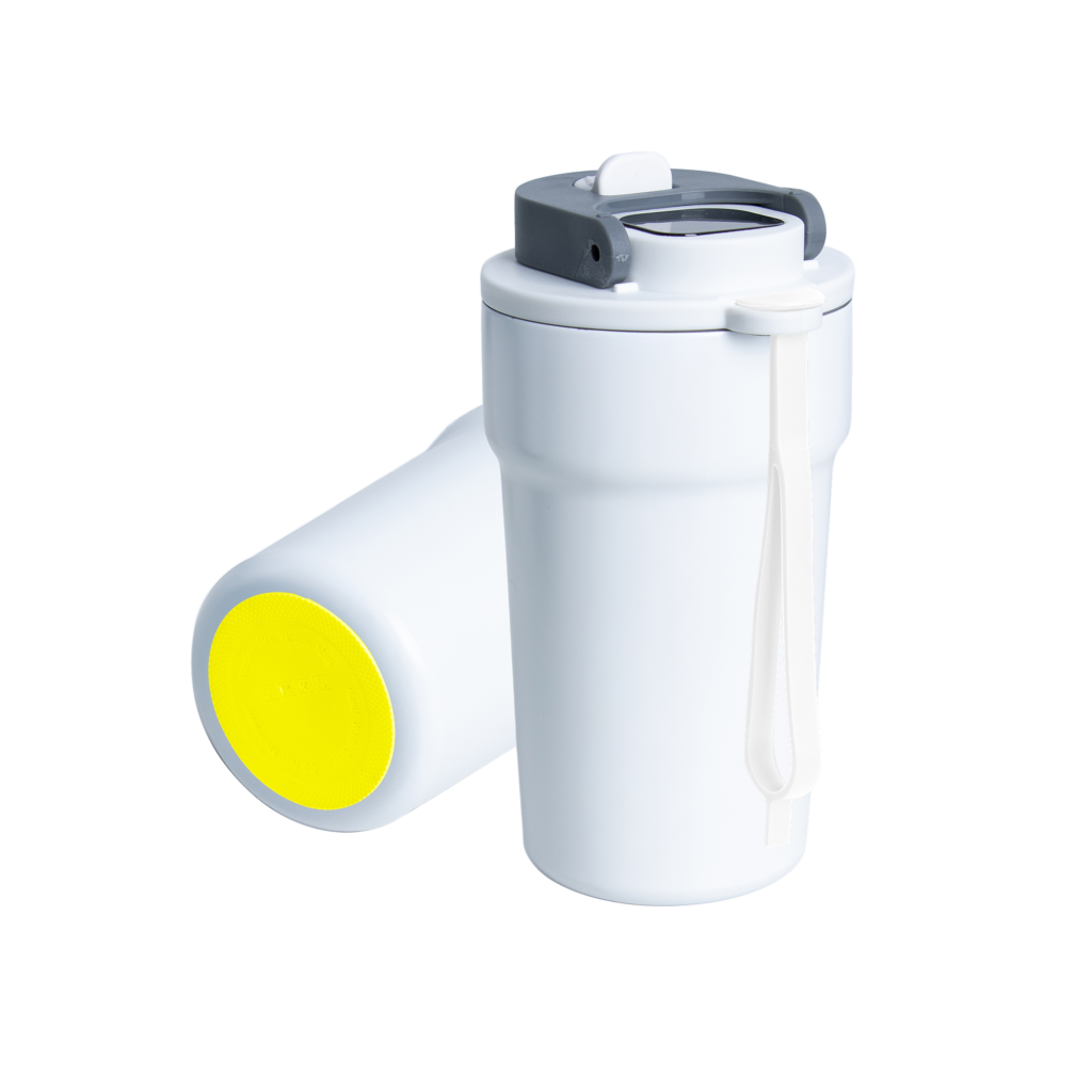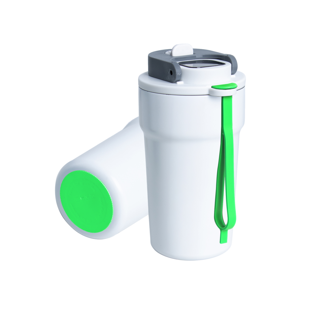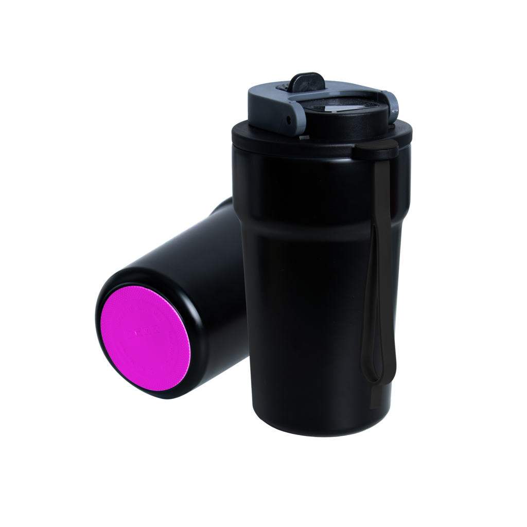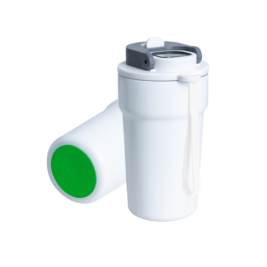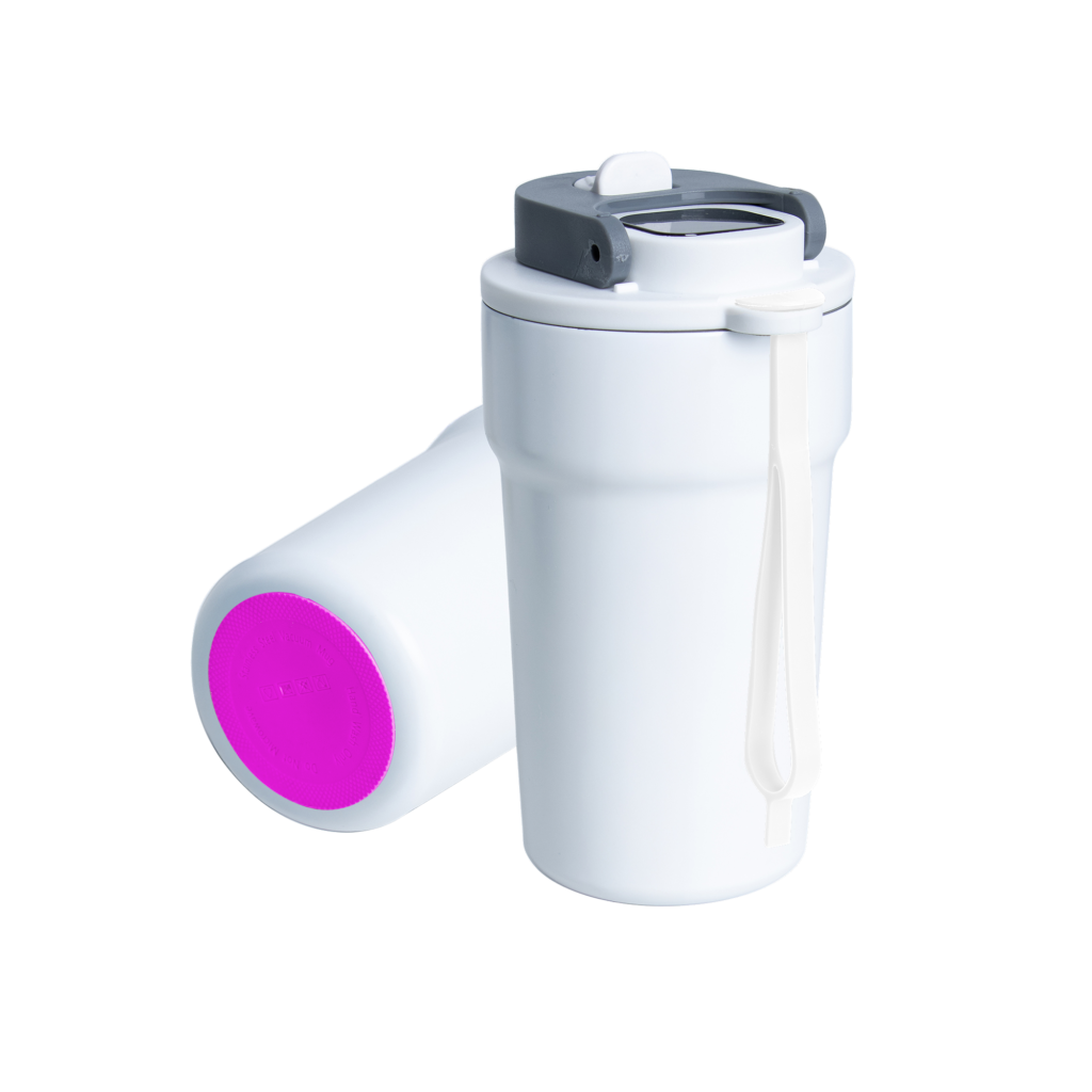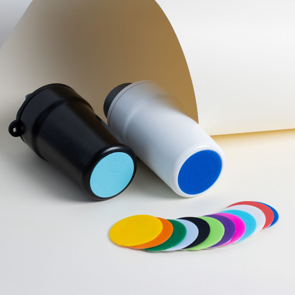 Dzięki technologii „chameleon” oferuje aż 192 unikalne kombinacje kolorystyczne – niezależny wybór koloru opaski silikonowej i podstawy antypoślizgowej przy czarnym korpusie, co pozwala idealnie dopasować kubek do Twojego stylu, firmy czy kampanii.